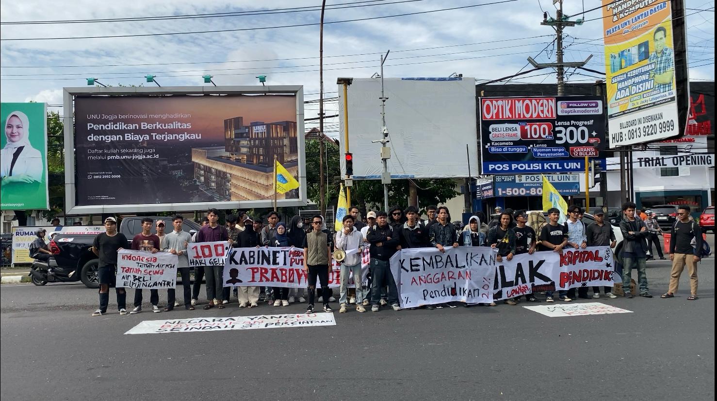 SUARARAKYATINDO.COM – Yogyakarta, Aliansi Generasi Z atau Gen-Z gelar aksi demontrasi di simpang tiga jalan Solo atau dikenal pertigaan revolusi UIN Sunan Kalijaga pada Rabu, (12/2/2025). Aksi itu digelar untuk mengevaluasi 100 hari kerja Pemerintahan Presiden Prabowo Subianto dan Gibran Rakabuming Raka.