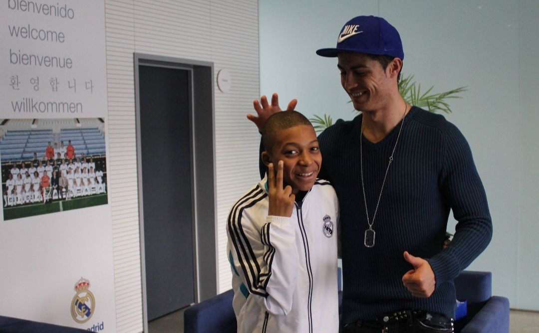 Salah satu foto menampilkan Mbappe kecil berpose bersama mantan pemain Real Madrid, Cristiano Ronaldo.