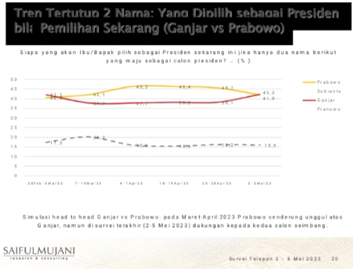 Deni melanjutkan bahwa dalam simulasi head to head ini, Prabowo terlihat cenderung unggul atas Ganjar pada bulan Maret sampai April 2023. Namun memasuki bulan Mei, pasca deklarasi Ganjar oleh PDIP, Ganjar mulai mengimbangi Prabowo. Bahkan, dalam simulasi di antara yang mengenal keduanya, Ganjar telah menyalip Prabowo.
