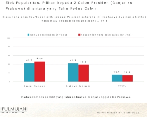 Pada kelompok pemilih yang tahu kedua tokoh, Ganjar menjadi unggul atas Prabowo. Ganjar mendapatkan dukungan 46,4 persen suara, sementara Prabowo 38,8 persen. Masih ada 14,8 persen yang belum menjawab.