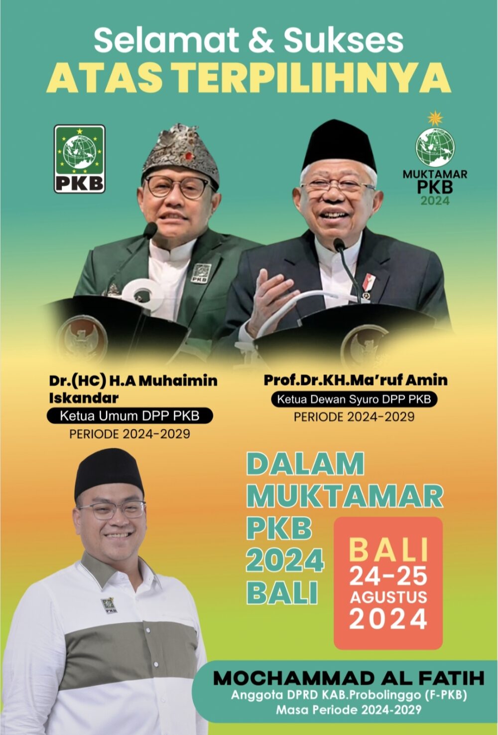 “Selamat terpilih KH. Ma’ruf Amin Sebagai Dewan Syuro PKB dan Gus Muhaimin Iskandar sebagai Ketua Umum PKB 2024-2029